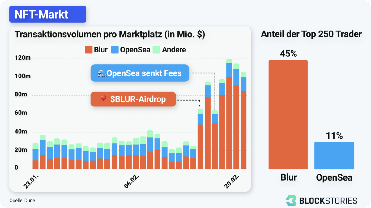 Blurred: Seit dem Airdrop des NFT-Marktplatzes Blur sind die täglichen Transaktionsvolumina am NFT-Markt durch die Decke gegangen. Dass OpenSea seine Gebühren (Marktplatz + Royalties) angepasst hat, hat sich allerdings bisher kaum für sie rentiert.