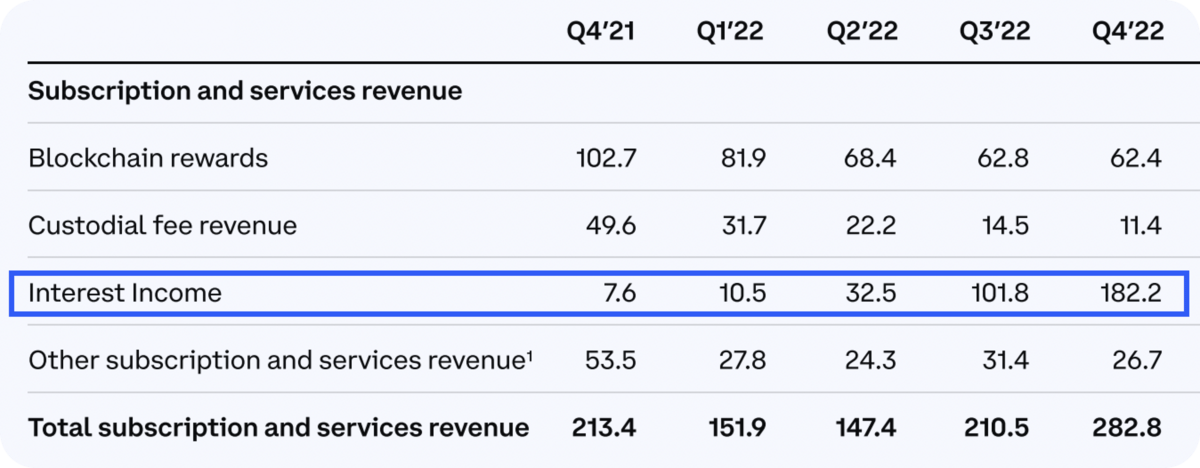 Während Coinbase' Trading- und Staking-Business enorm unter den gestiegenen Leitzinsen leiden (⬇️ Volumen, ⬇️ Preise), sind sie als Co-Emittent des US-Stablecoins USDC trotzdem auch Profiteur.