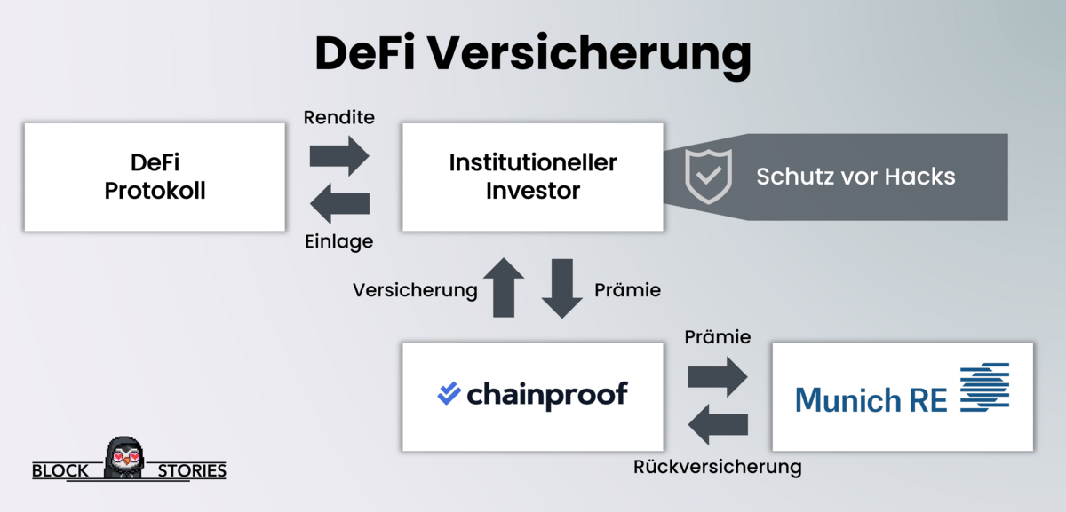 Aber die Rettung ist da! Mit Chainproof ist letzte Woche das erste Versicherungsprodukt für einige Länder lizenziert worden, das institutionelle Investoren gegen einen Raub durch Protokoll-Hacks versichert.