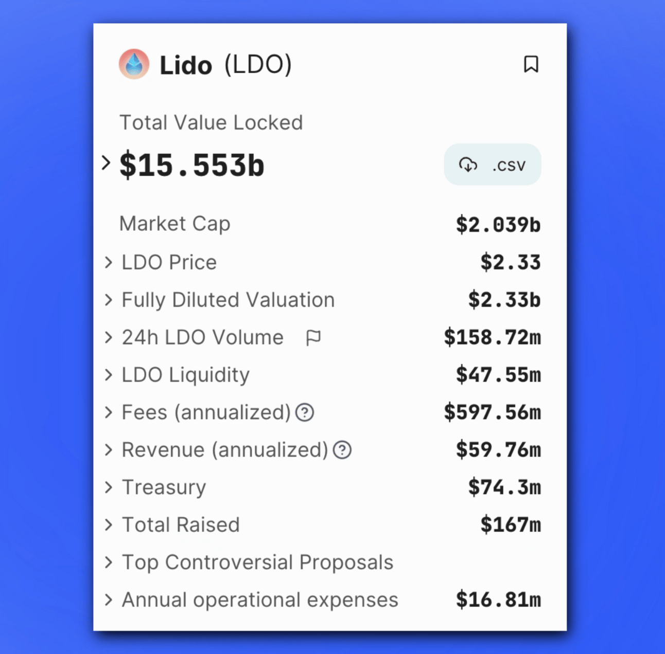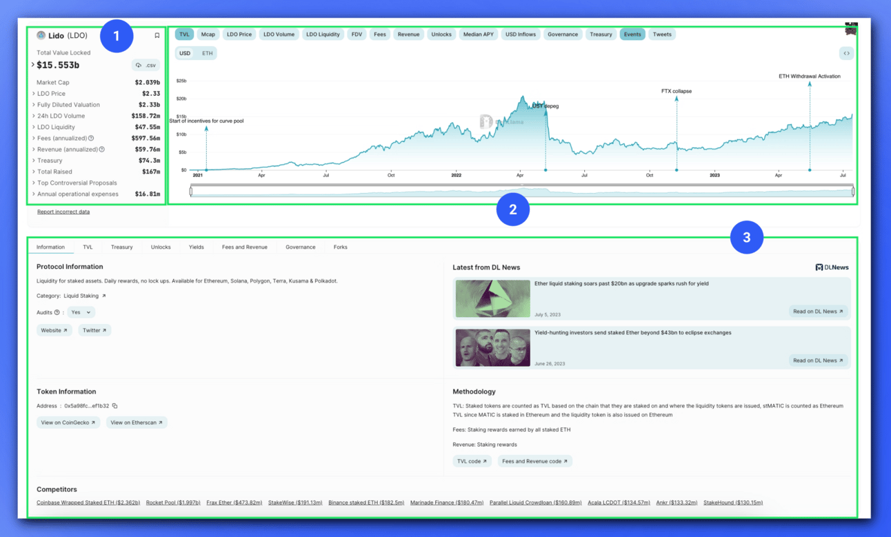 Protokoll-Steckbrief: Bietet einen Überblick über die wichtigsten Metriken eines Protokolls (und falls vorhanden, ihres Tokens), wie z.B dem TVL und den Einnahmen