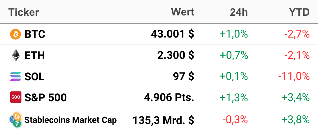 Tether: Der Stablecoin-Emittent hat sein Prüfungsurteil für das vierte Quartal 2023 veröffentlicht. Das Unternehmen weist darin einen Nettogewinn von rund 2,8 Milliarden USD aus, wobei es seine Überschussreserven auf insgesamt 5,4 Milliarden USD erhöhen konnte. 📈
