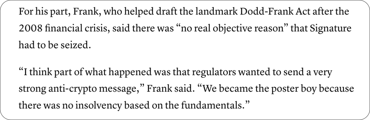 Auch weil Barney Frank, ehemaliger Kongressabgeordneter und bisheriges Aufsichtsratmitglied der Signature Bank, gestern öffentliches Unverständnis über die Schließung der Bank äußerte. Seiner Meinung nach habe es keinen objektiven Grund gegeben, die Signature Bank zu schließen. Er vermutet vielmehr politische Gründe.
