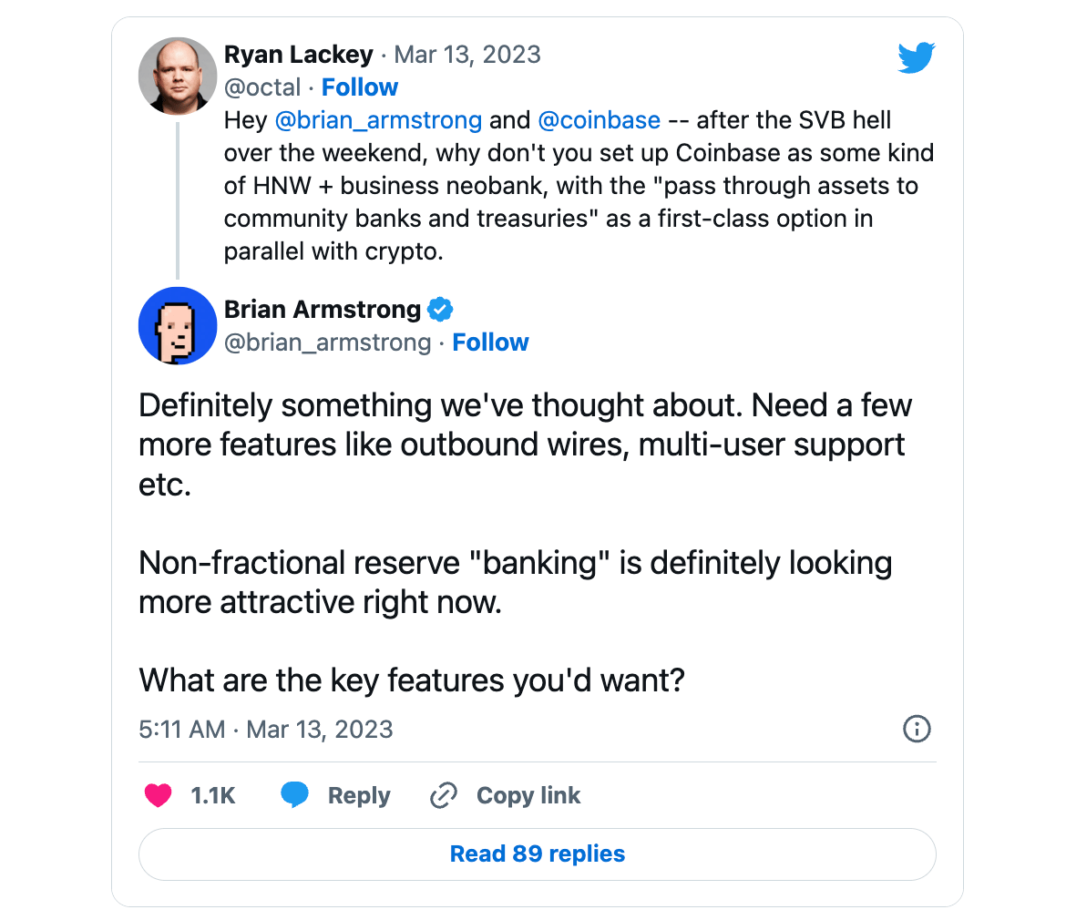 Neben einem halben Dutzend kleinerer Banken wie der Cross River Bank und der Customer Bank könnte sich mittelfristig womöglich auch Coinbase zum Banking-Partner aufschwingen. Zumindest denken sie intern darüber nach.