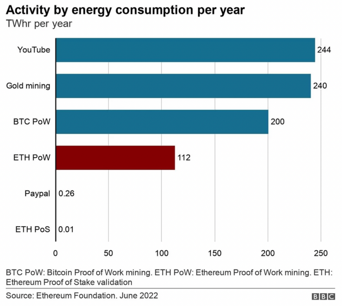 Aussage: Die BBC greift auf Zahlen der Ethereum Foundation zurück, die den Impact des Wechsels von Proof-of-Work auf Proof-of-Stake zeigen. Die Zahlen sind mit Vorsicht zu genieĆen, an der Kernbotschaft zweifelt jedoch niemand: Der Merge wird als eines der erfolgreichsten Dekarbonisierungsprojeke in die Geschichtsbücher eingehen.