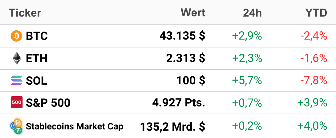 Dass sich Bitcoin seit Freitag erholen konnte und mittlerweile wieder deutlich nördlich der 40.000 USD notiert, scheint vor allem den jüngsten ETF-Daten geschuldet zu sein, die auf rückläufige Abflüsse aus Grayscales ETF schließen lassen. Setzt sich dieser Trend in dieser Woche fort, dürfte aufgeatmet und der Fokus neuen Themen gewidmet werden.