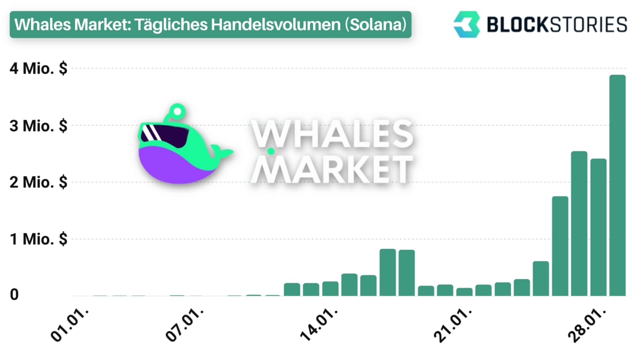 Gestern hat Whales Market, ein Peer-to-Peer Handelsplatz, ein Handelsvolumen von knapp 3,7 Millionen USD auf dem Solana Netzwerk verzeichnet und somit einen neuen persönlichen Höchstwert erreicht.