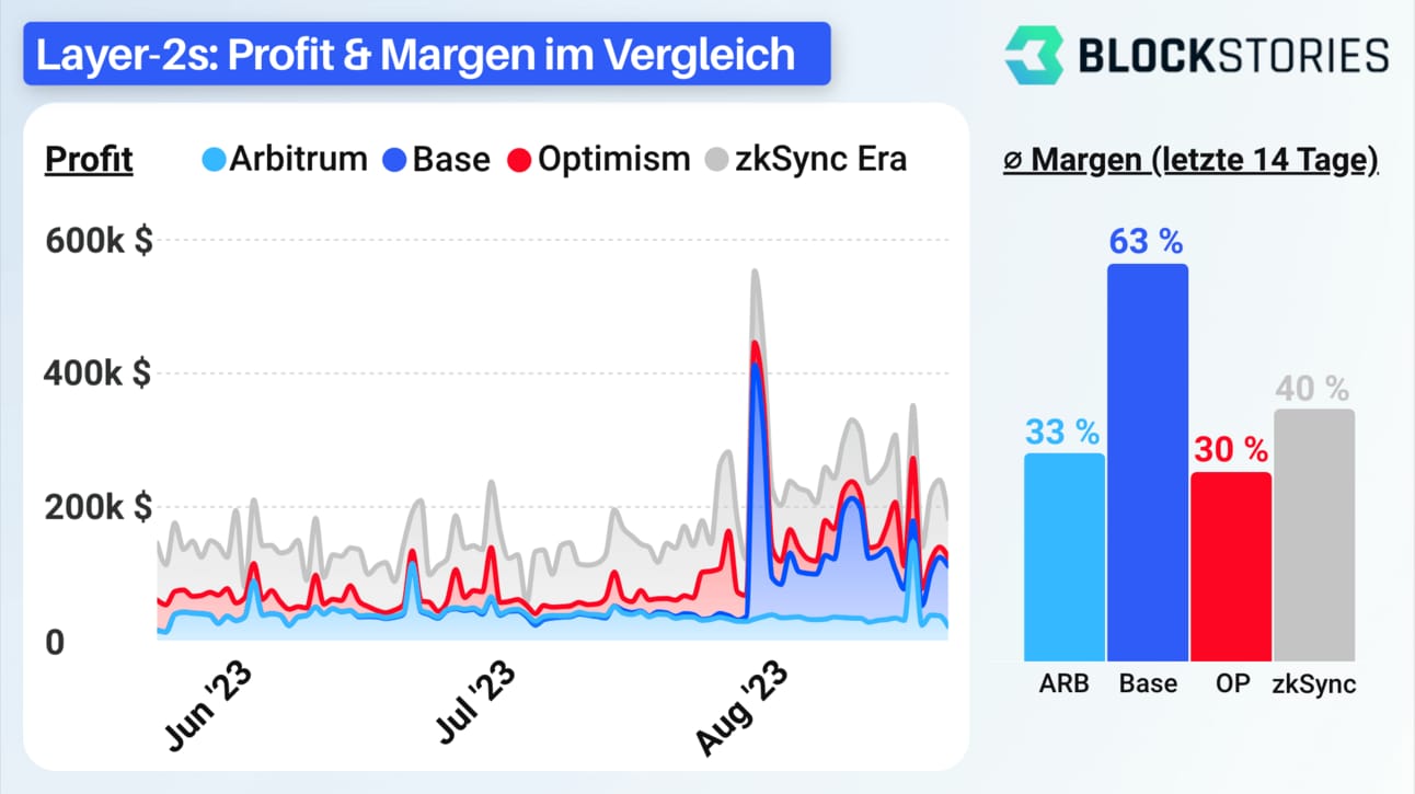 Doch was macht Base so profitabel? Im Schnitt sind die Transaktionsgebühren auf der Layer-2 höher als auf Arbitrum und Optimism. Die Kosten für die Datenübertragung bisher hingegen nur halb so hoch.