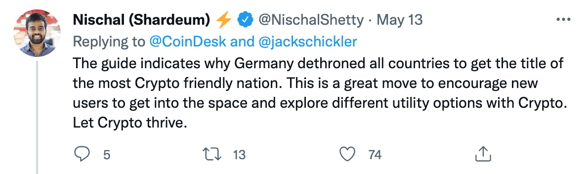+ Rechtliche Sicherheit ist extrem wichtig, um nicht nur mehr Privatanleger für Krypto zu begeistern, sondern vor allem auch um institutionelle Investoren anzuziehen. Insofern ein guter nächster Schritt!