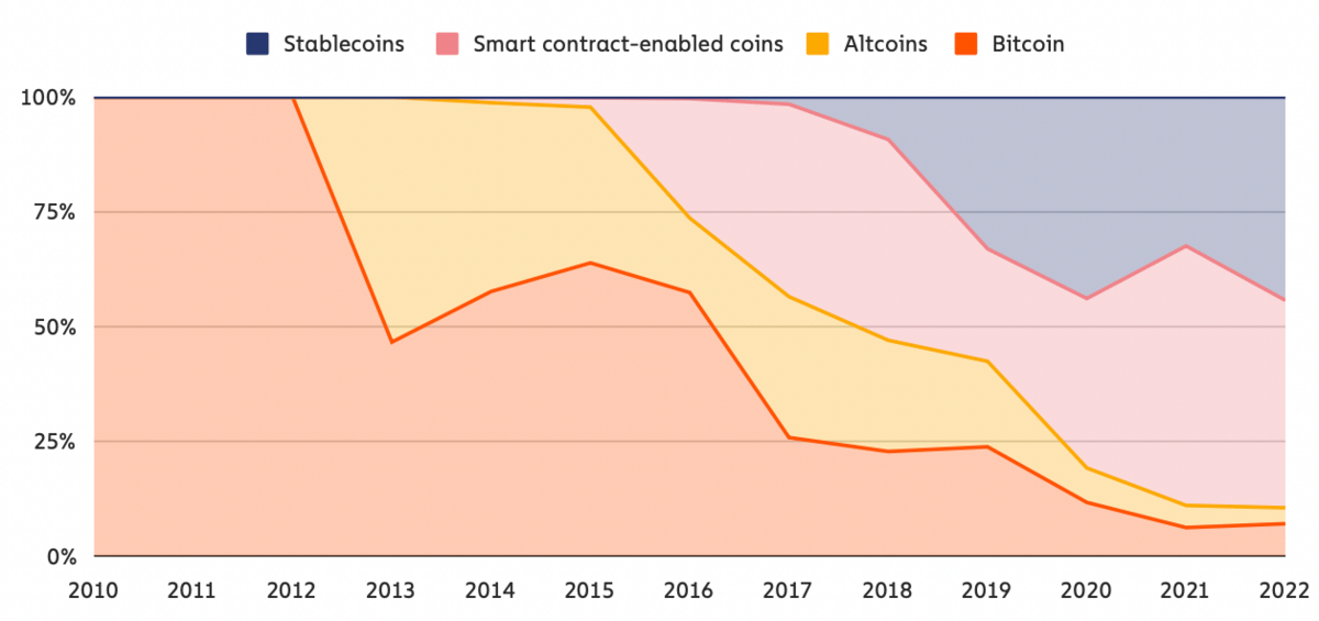 Bitcoin kommt dadurch nur noch auf 10% Anteil am Transaktionsvolumen aller Kryptowährungen.
