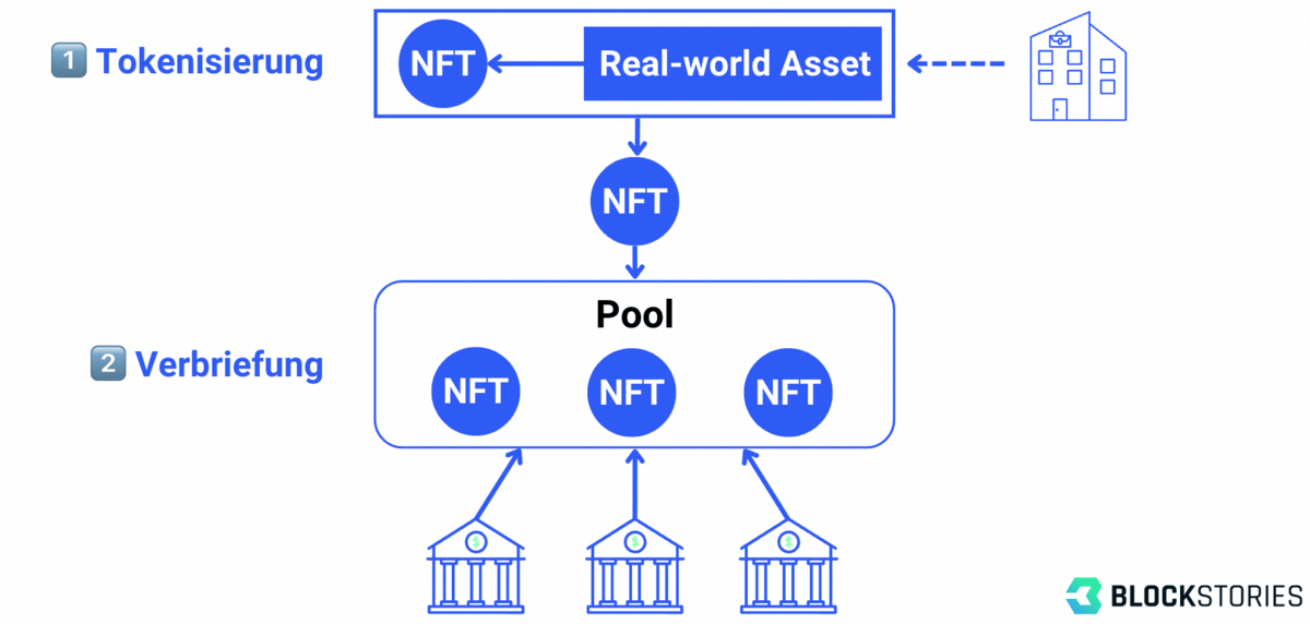 Konkret bedeutet das, dass sich mittels unserer Plattform real-world Assets, denen wiederkehrende Cash Flows zugrunde liegen (z.B. Immobiliendarlehen oder Rechnungen), als NFTs tokenisieren und mit anderen NFTs in einem Liquidity Pool bündeln lassen ("Verbriefung").