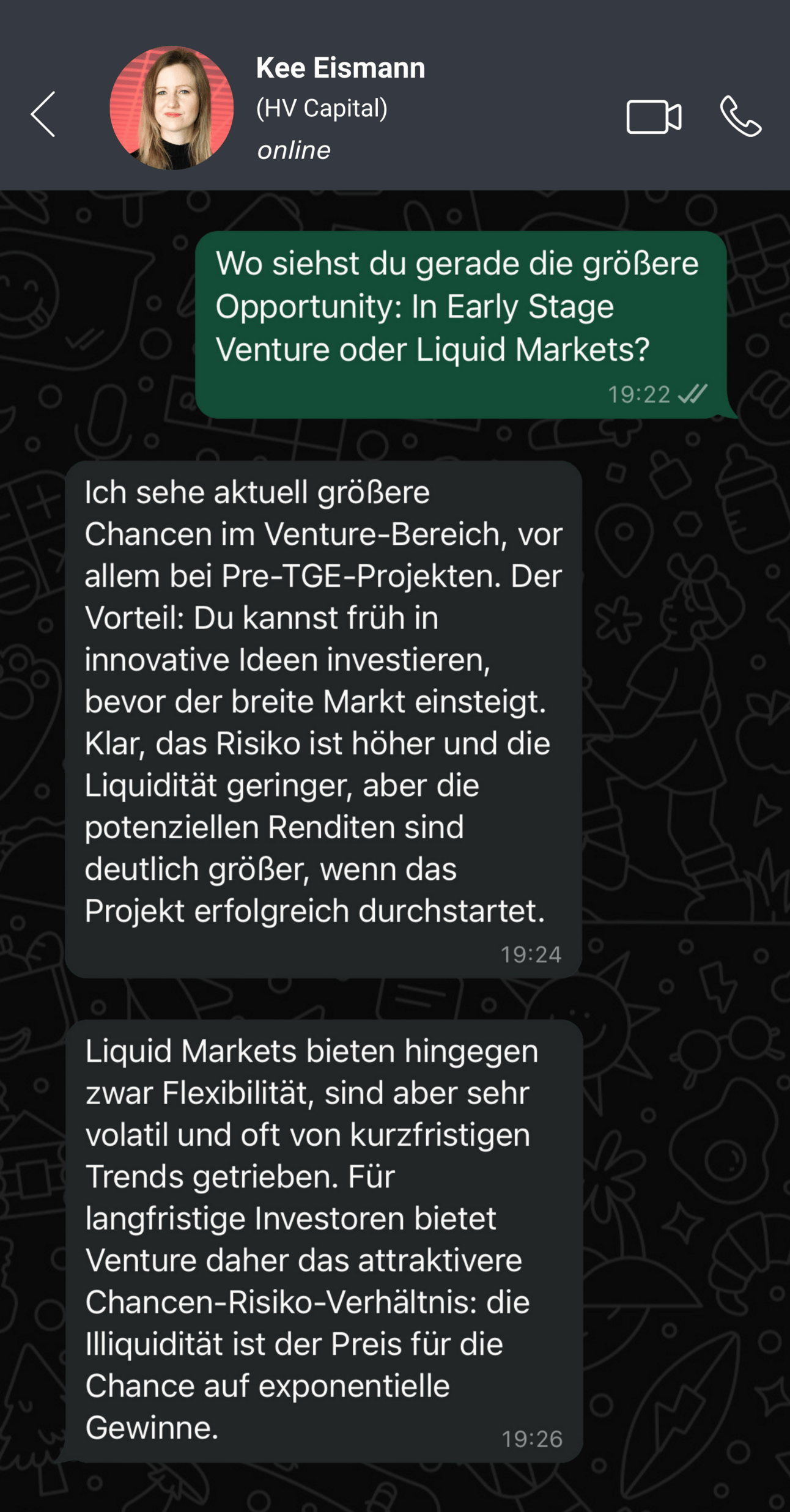 Kee Eismann ist Co-Head Crypto Investments bei HV Capital, einem der führenden Wagniskapitalgeber Europas. Unter professionellen Investoren wurde zuletzt immer wieder über die Attraktivität von Liquid vs. Venture Investing diskutiert, weswegen wir Kee mal nach ihrer Meinung gefragt haben.