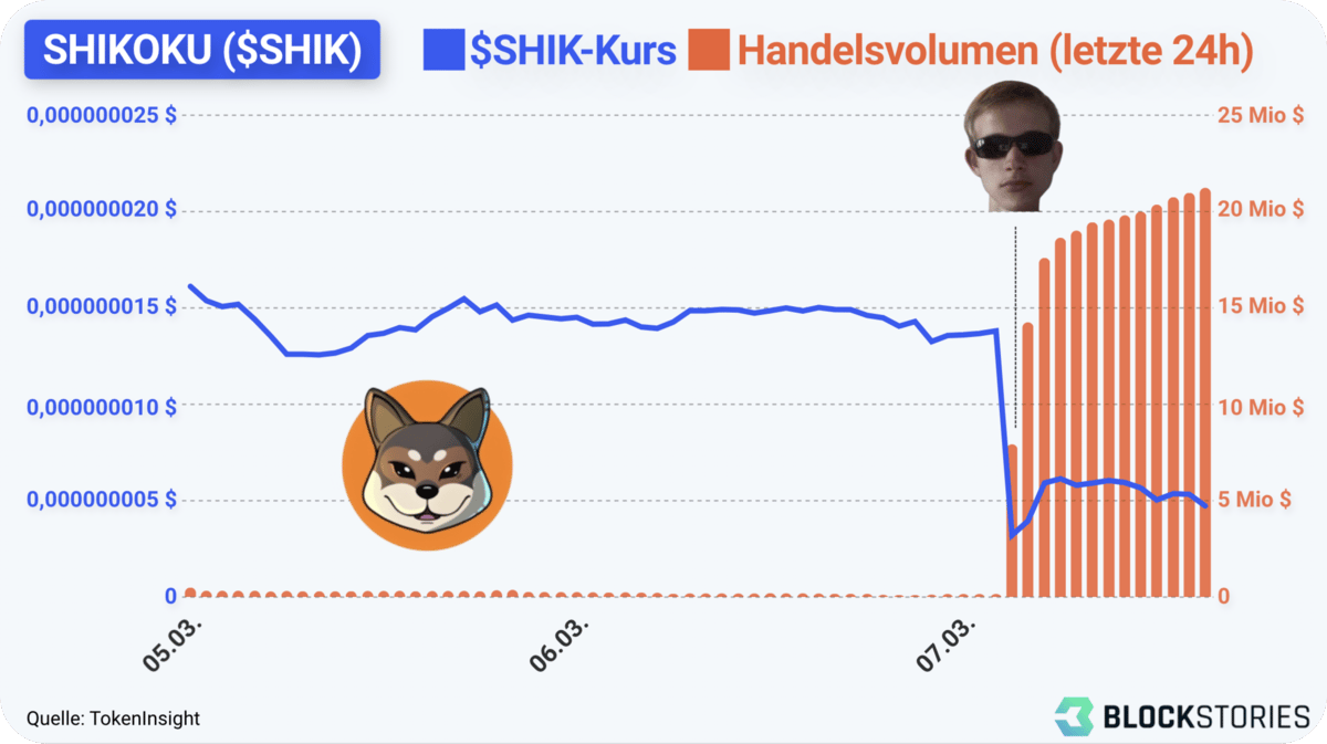 SHIKOKU: $SHIK ist unter den Betroffenen. Ganze 500 Billionen $SHIK-Tokens verkaufte Vitalik ab, woraufhin der Kurs um über 60% einbrach. Die Änderung im Handelsvolumen spricht Bände.