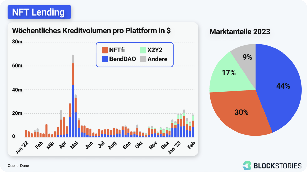 In den Kinderschuhen: Mit ≈ 2.000 aktiven Wallets stehen Lending-Protokolle noch ganz am Anfang. Aktuell führend ist BendDAO mit einem Marktanteil von 44%.