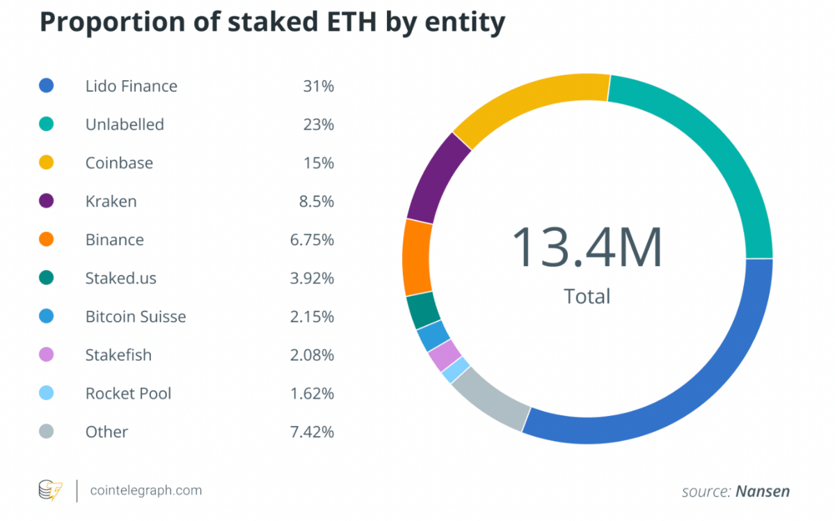 Aussage: 5 Anbieter sind für 64% des Gesamtaufkommens an staked ETH verantwortlich. Nach dem Merge wird die Debatte um die dominante Marktstellung von Lido zunehmen.