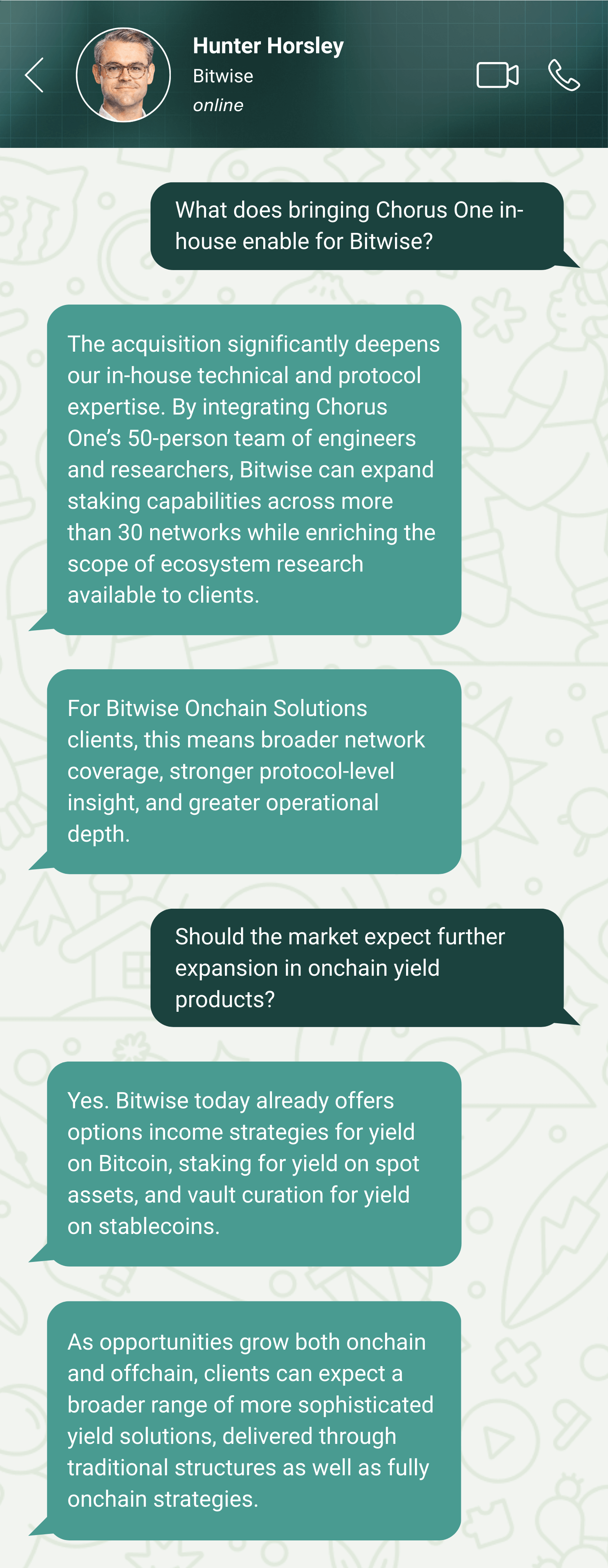Behind the scenes: Following our recent article, we spoke with Hunter Horsley, CEO of Bitwise Asset Management, to better understand how the acquisition of Chorus One expands Bitwise’s capabilities.