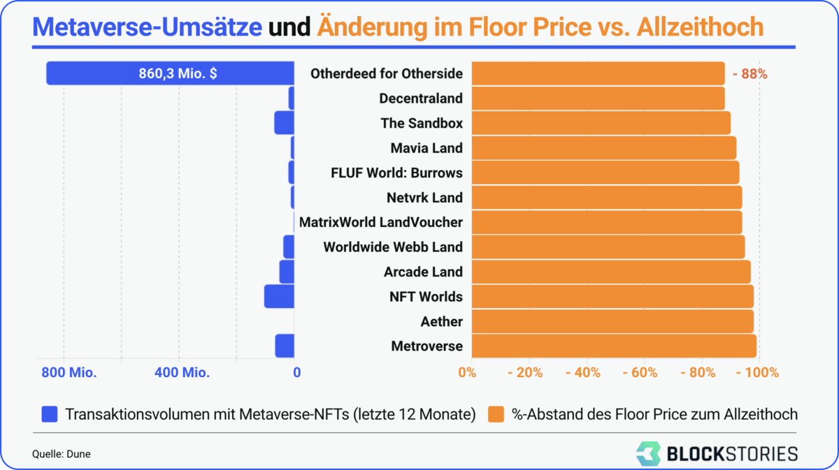 Aktuell sind die Floor Preise der jeweiligen Metaverse-NFTs mind. 88% vom Allzeithoch entfernt. Auch das Transaktionsvolumen ist zuletzt massiv eingebrochen.
