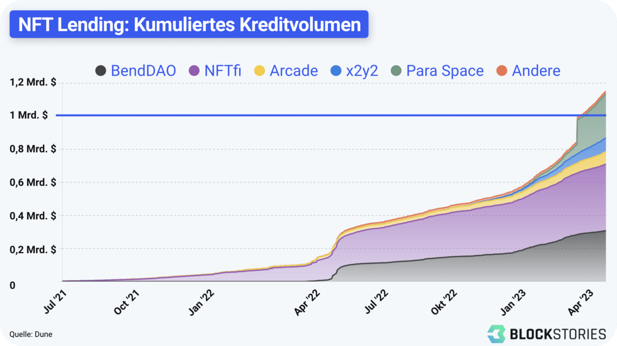 NFT Lending: Einer der großen Trends im NFT-Markt ist die sog. "Financialization" von NFTs, kurz NFTFi genannt. NFT Lending-Protokolle wie BendDAO und NFTfi erlauben Nutzern, ihre NFTs als Sicherheit zu hinterlegen und einen Kredit aufzunehmen. Dank erhöhter Handelsaktivität und neuer Protokolle hat der noch junge NFT-Lending-Markt vor kurzem die Grenze von 1 Mrd. $ kumulierten Kreditvolumens überschritten.